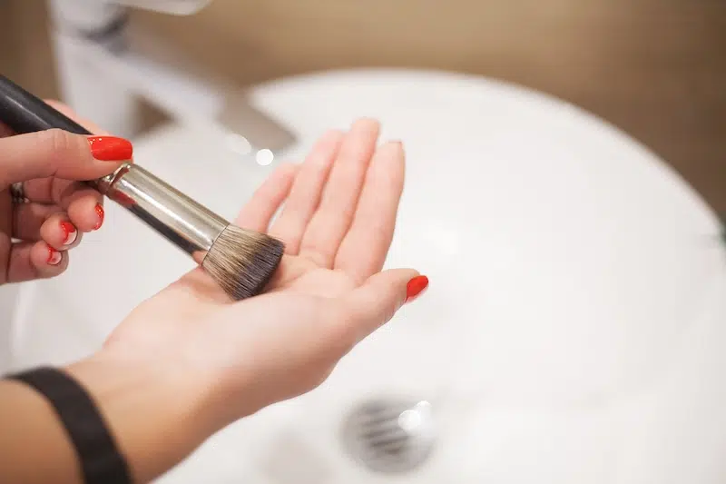 Wer besonders hygienisch arbeiten möchte, kann den trockenen Pinsel anschließend leicht mit Alkohol-Spray benetzen. Das tötet Bakterien ab und ist besonders wichtig bei Hautunreinheiten oder sensibler Haut.