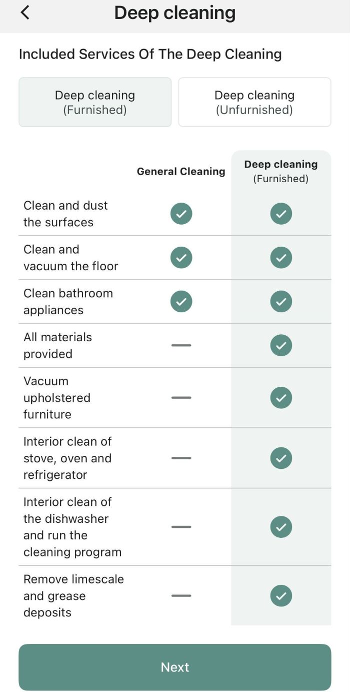 The exact tasks that are performed during a cleaning session depend primarily on what you agree on with your cleaner. No two apartments are alike, and customers’ expectations may vary.