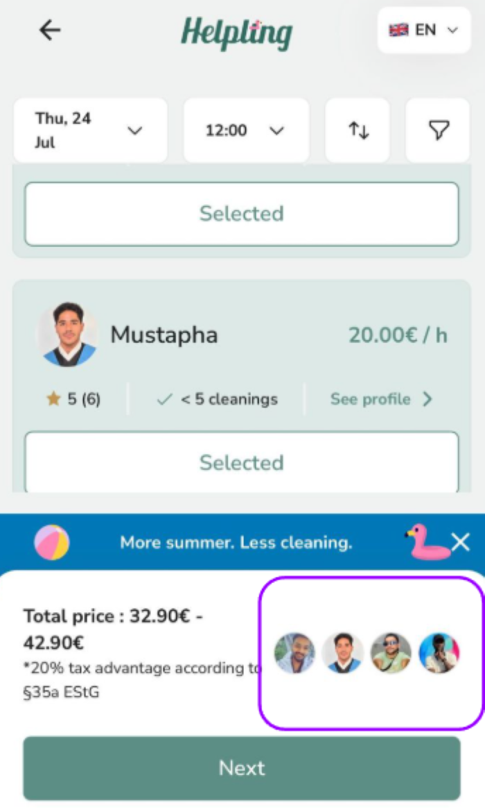 Helpling will then suggest a selection of cleaners who fit your time slot. You will have access to profiles with photos, reviews, prices, and experience ratings. This information will help you make an informed decision. You decide who comes into your home, without any opaque matching.