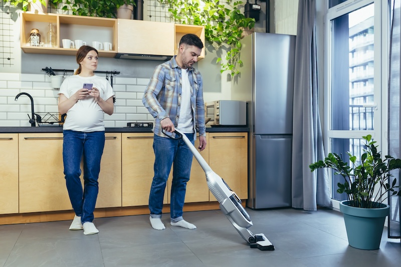A man vacuums a modern kitchen with wooden cabinets. A woman stands nearby holding a smartphone. Green plants and natural light create a calm atmosphere.